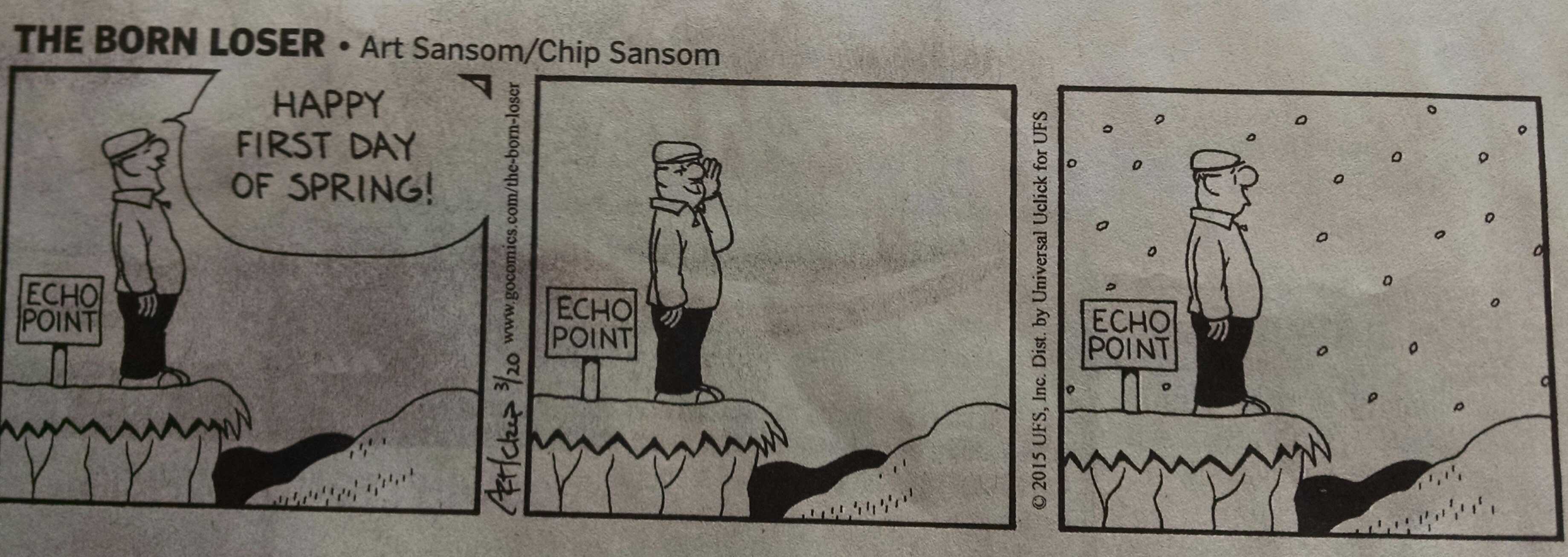 As I was driving to work, I was just about to express my displeasure to God in prayer, when it occurred to me it’s still the first day of Spring! An occasional snow squall or ice storm or even freezing rain will happen–because that’s what Spring is.